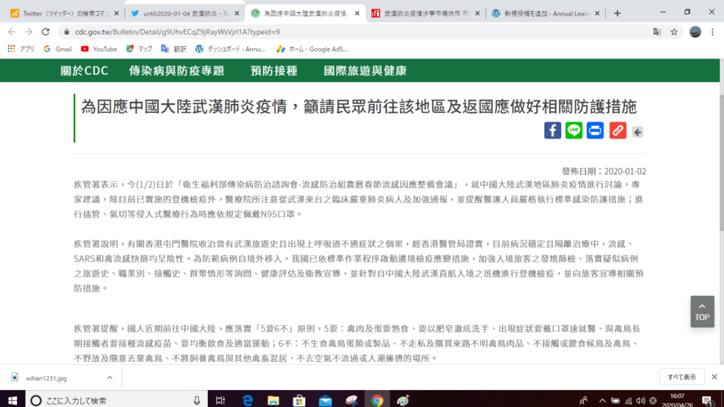 1/2 台湾の疾管署(CDC)、機内検疫のほか、病院に「標準感染防護措置」を厳格に実施するよう指示したのがこの日でした。