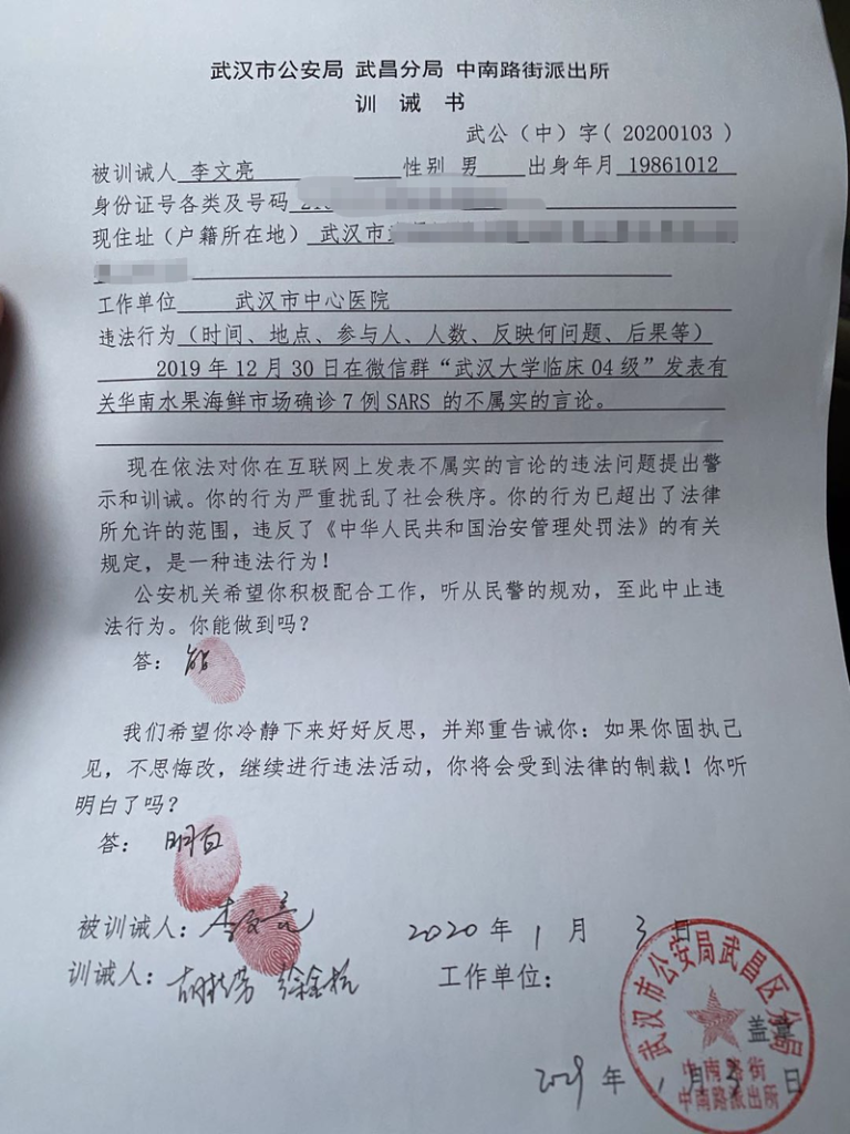 武漢市公安局武昌区分局の中南路派出所に呼び出された。そこで懲戒書への署名を求められ、訓戒処分を下された。