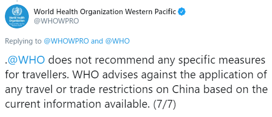 WHOがコロナウィルスが新型のものであることを否定できないと明言する一方で、中国からの入国や貿易に制限をかけることを勧めないと発信した。