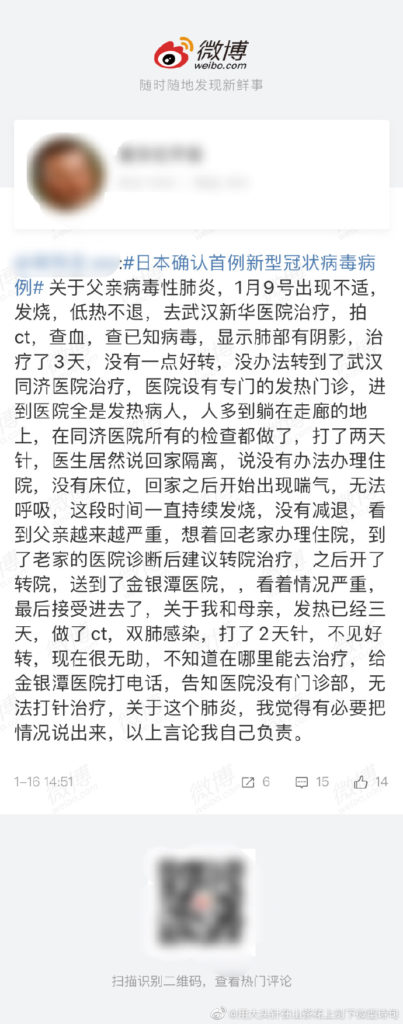 また、Weibo上に武漢の状況を伝える書き込みが上がっていた。